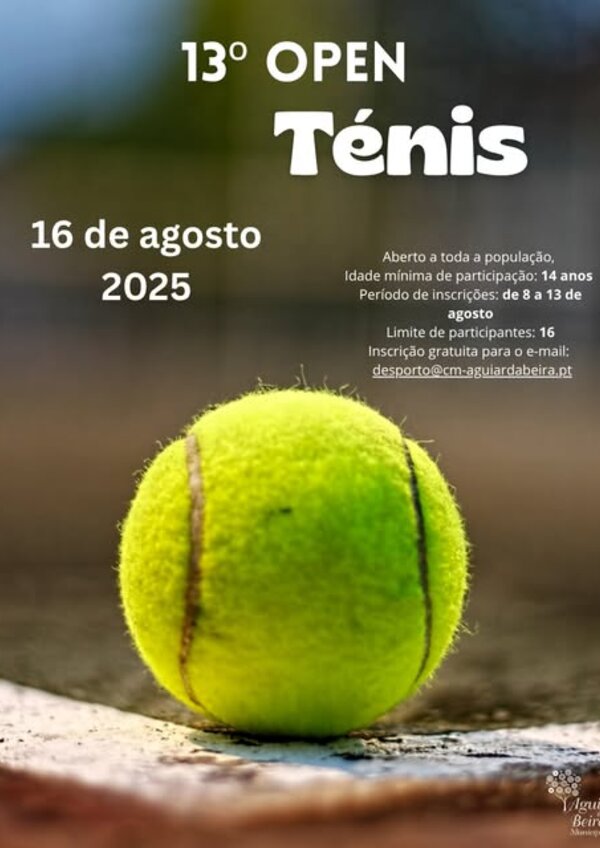 O 𝟏𝟑.º 𝐎𝐩𝐞𝐧 𝐓𝐞́𝐧𝐢𝐬 𝐝𝐞 𝐀𝐠𝐮𝐢𝐚𝐫 𝐝𝐚 𝐁𝐞𝐢𝐫𝐚, terá lugar no dia 𝟏𝟔 𝐝𝐞 𝐚𝐠𝐨𝐬𝐭𝐨 𝐝𝐞 𝟐𝟎𝟐𝟓, no Complexo Desportivo de Aguiar da Beira. A ... -