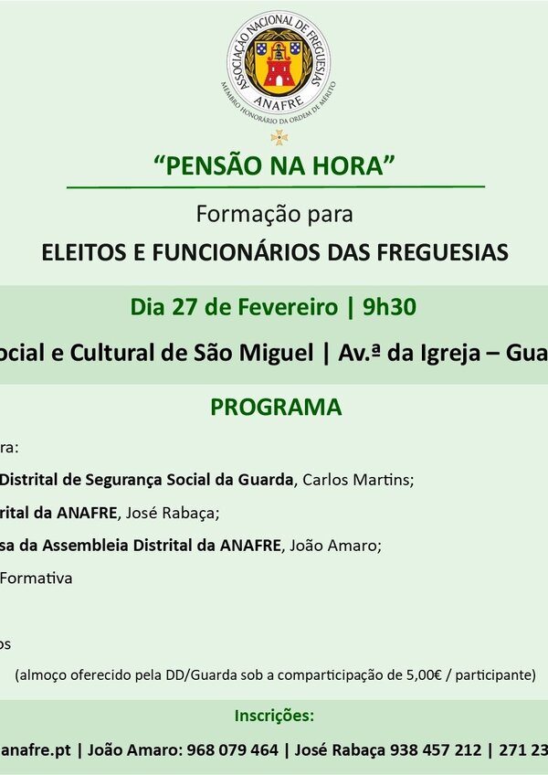 A ANAFRE promove no próximo dia 27 de fevereiro, uma Formação dirigida aos eleitos e funcionários das Freguesias do Distrito. ... -