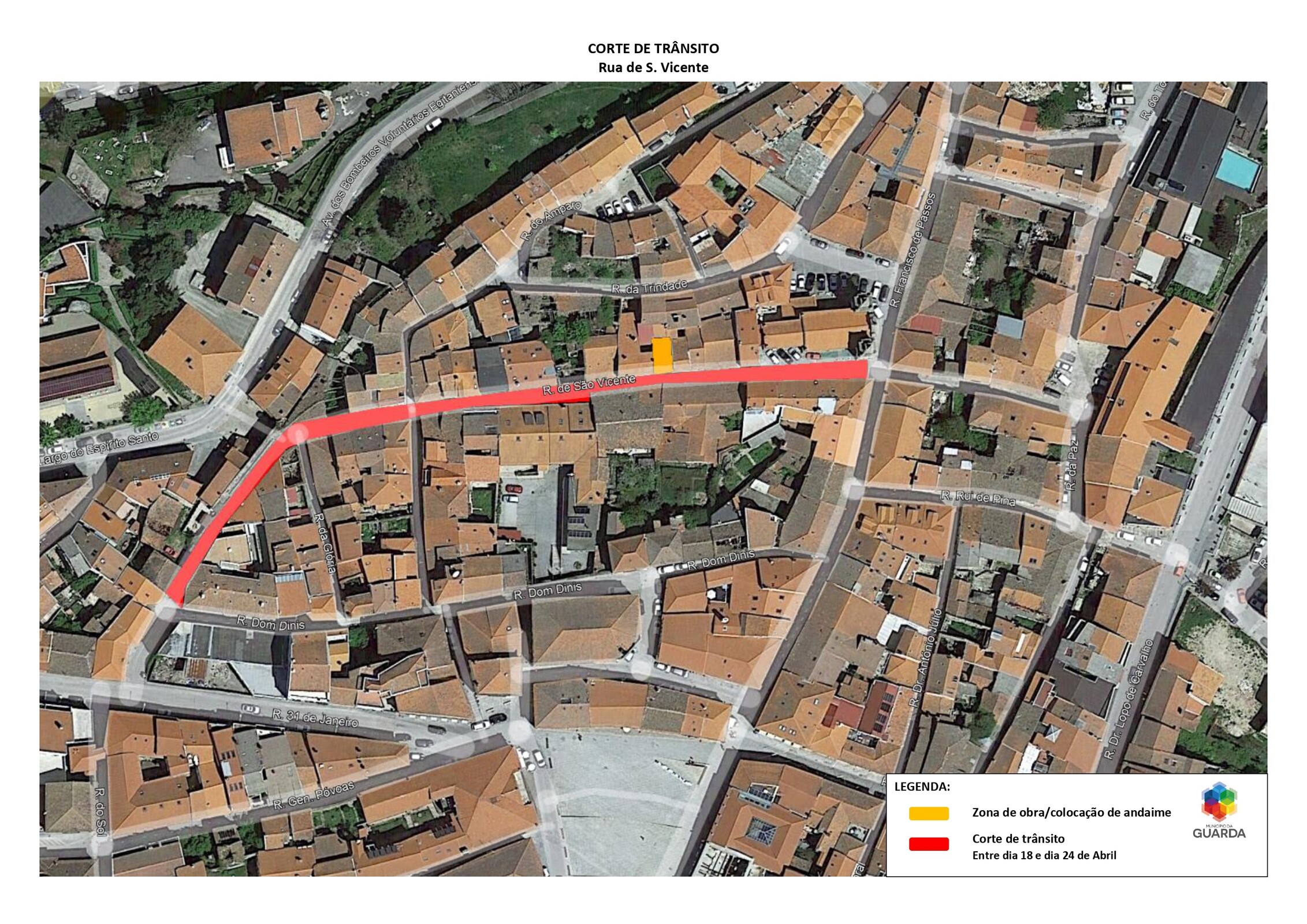 O Município da Guarda informa que, que no âmbito da empreitada “Implementação de um Sistema de Informação em Tempo Real aos Utentes dos Transportes Urbanos da Guarda”, por forma a se efetuarem trabalhos de infraestruturas subterrâneas, a partir do próximo dia 19 abril e pelo prazo de 1 semana aproximadamente, torna-se necessário proceder à ocupação parcial do passeio, na Rua Martinho Júlio da Costa (Junto à Escola Beatriz Ângelo), conforme localização em anexo.