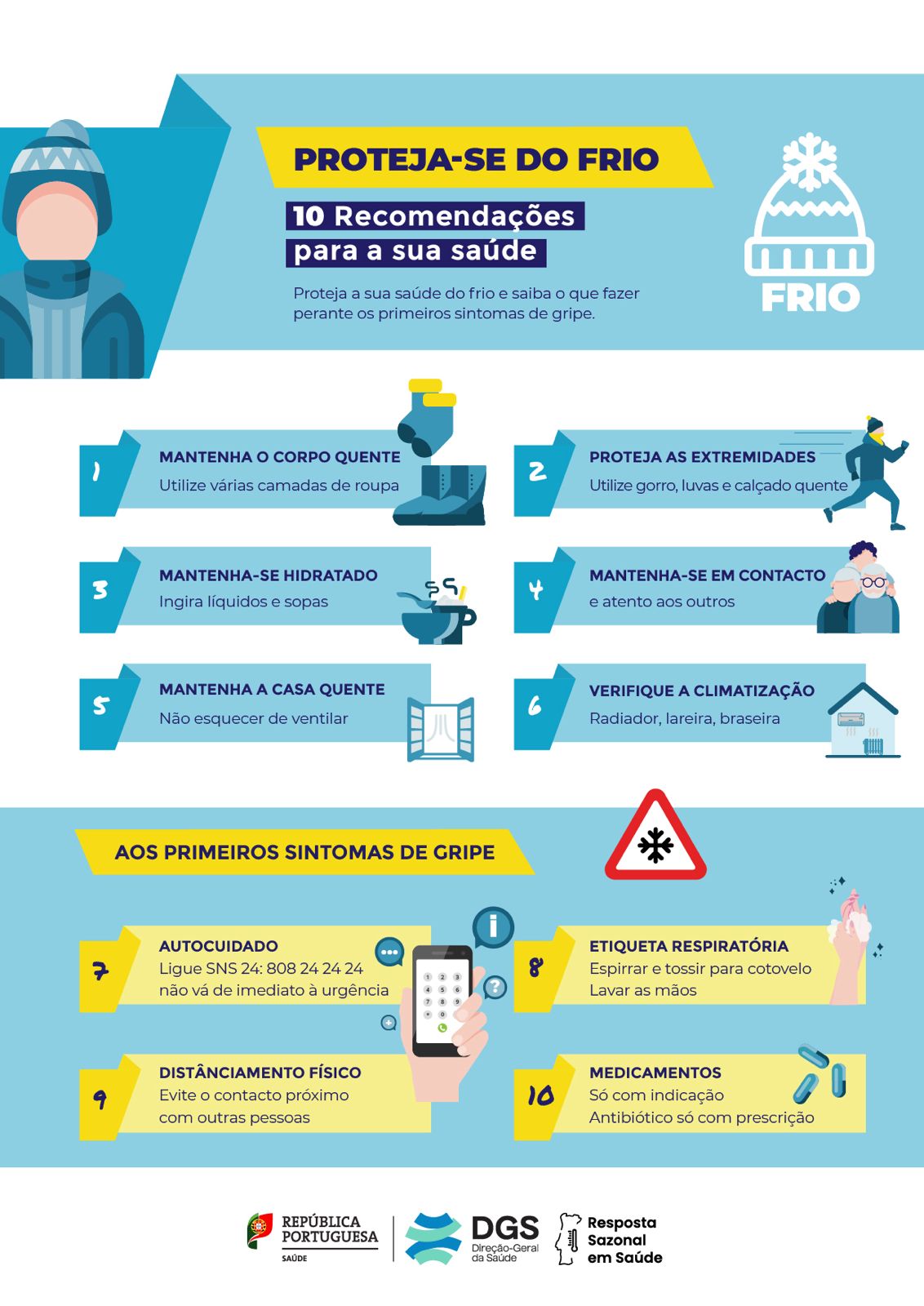Em situações de frio intenso são produzidas alterações no organismo que facilitam o aparecimento de doenças como a gripe e outras infeções respiratórias. Assim, a Direção-Geral da Saúde (DGS) reforça a recomendação para a vacinação contra a gripe, bem como a adoção das seguintes medidas, para se proteger do frio