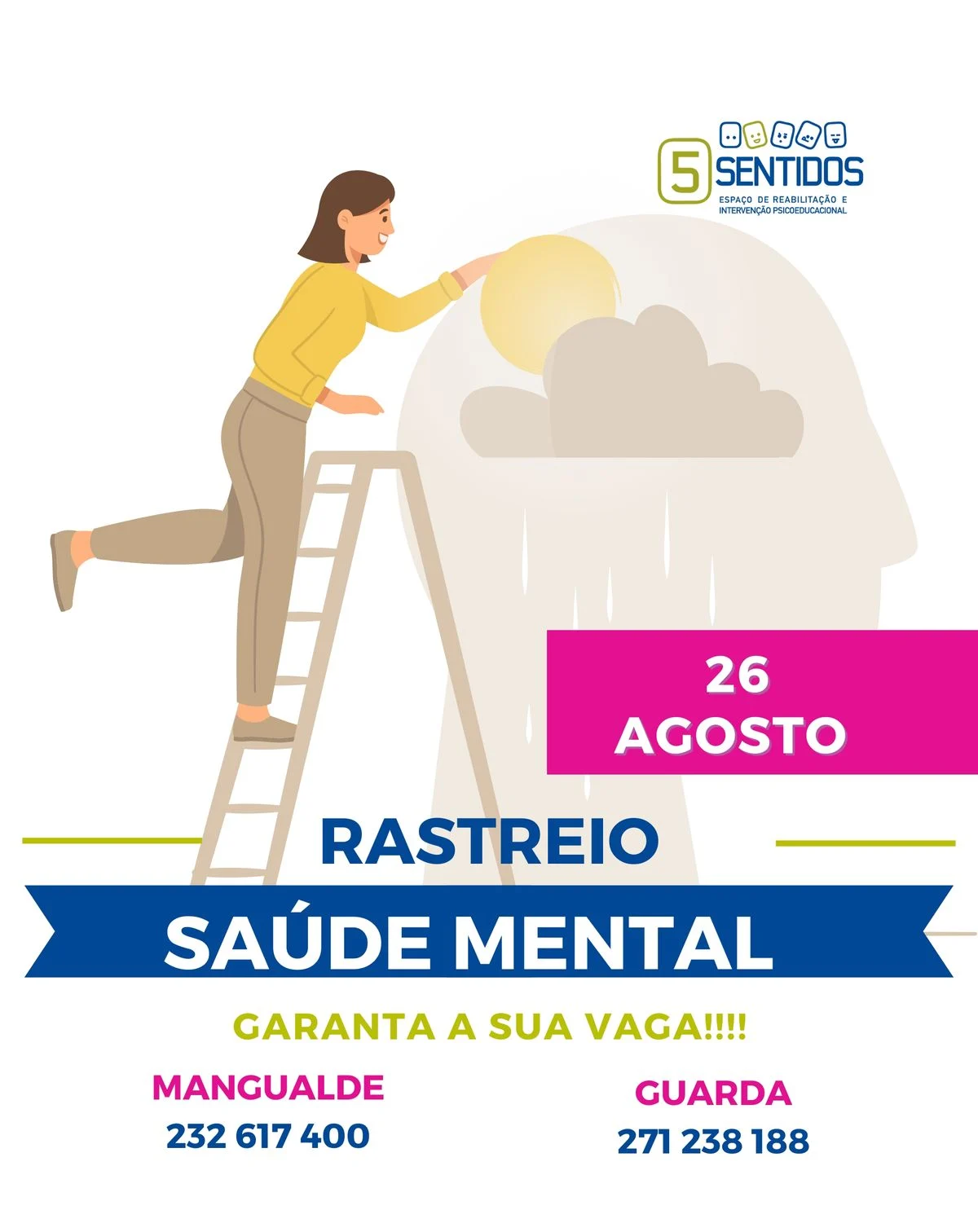 No próximo dia 26 de agosto, a equipa do 5 Sentidos, Espaço de Reabilitação e Intervenção Psicoeducacional, realizará, nos seus espaços de Mangualde e da Guarda, um Rastreio de Saúde Mental Gratuito para todas as faixas etárias.