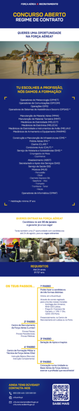 Candidaturas abertas para a força aérea até dia 30 de janeiro. Requesitos: até 24 anos com habilitação ...