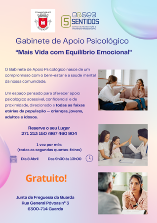 O Gabinete de Apoio Psicológico “Mais Vida com Equilíbrio Emocional” estará aberto dia 8 de abril desde as 9H30 às 13H00 na Sede Executiva da Junta de Freguesia da Guarda – Rua General Póvoas n.º 3, 6300-714, Guarda.