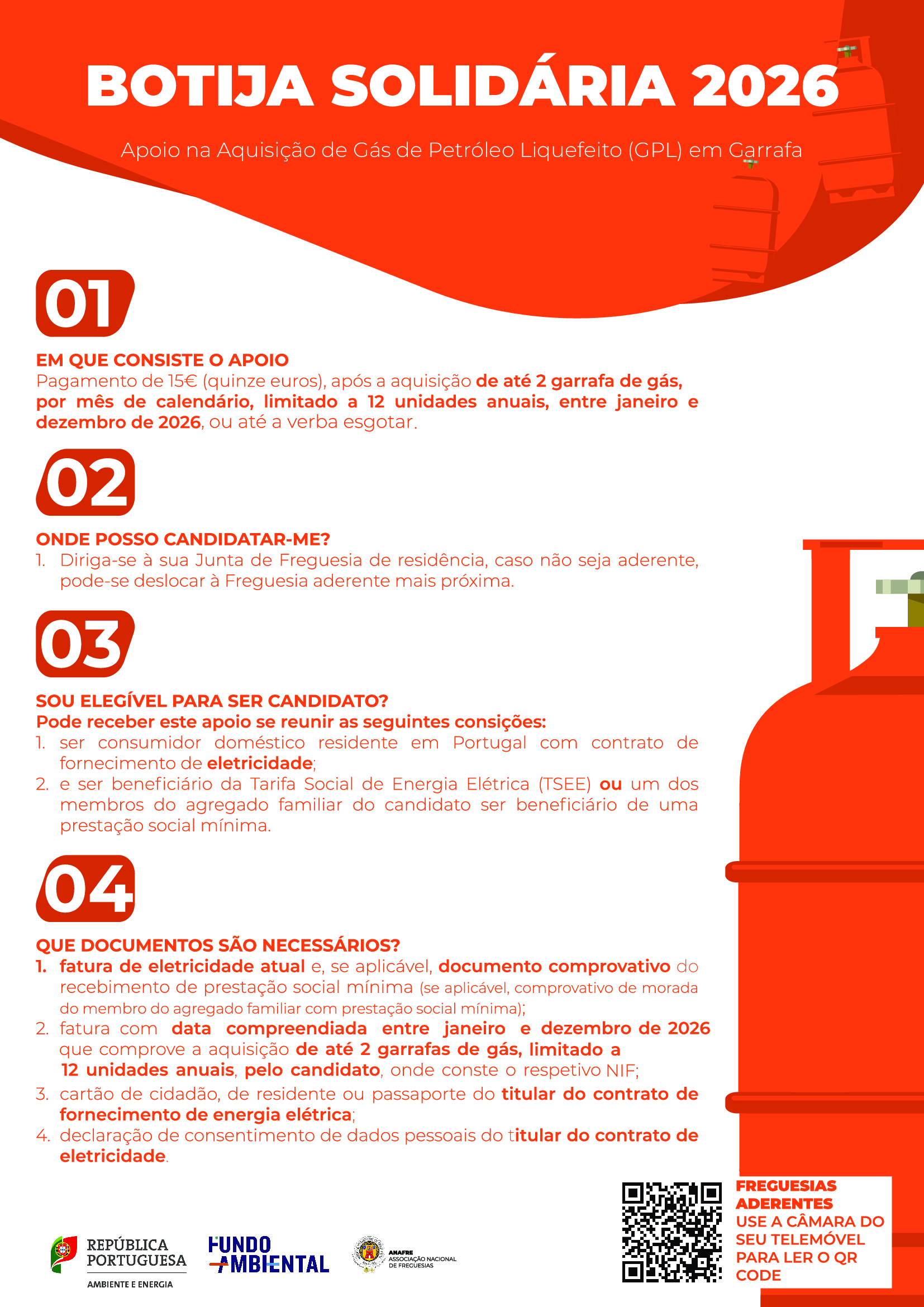 • Fatura que comprove a aquisição de até duas garrafas de gás de petróleo liquefeito (GPL), por mês de calendário, limitado a doze unidades anuais, durante o ano de 2026, onde conste o respetivo número de identificação fiscal (NIF) do titular do contrato de eletricidade beneficiário da TSEE, com data compreendida entre janeiro e dezembro de 2026 ou até que a verba se esgote;