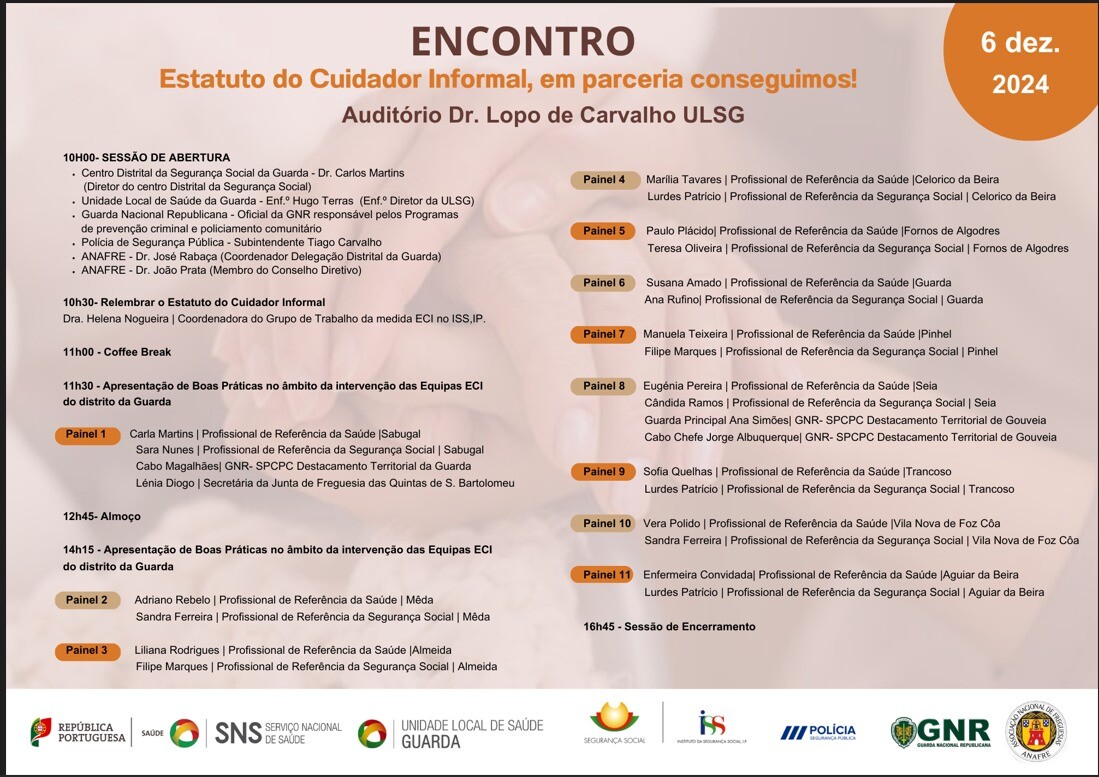 O encontro teve como tema o Estatuto do Cuidador Informal e a análise do trabalho que vem sendo realizado em todo o Distrito da Guarda, estando presentes representantes de 11 concelhos, sempre um representante da Unidade de Saúde, um representante da GNR ou PSP, e também um técnico da Segurança Social.