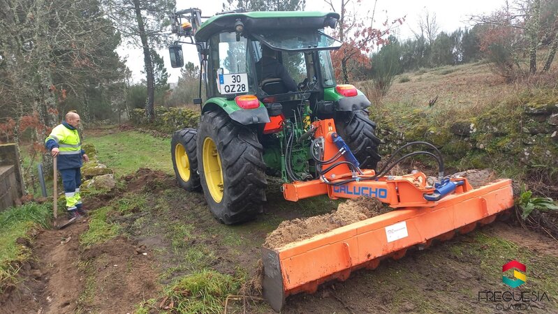 Colocámos em funcionamento o biotriturador para reduzir a estilha de toda a lenha que fomos desbastando das árvores ao longo dos caminhos do Monte Barro até aos Galegos.