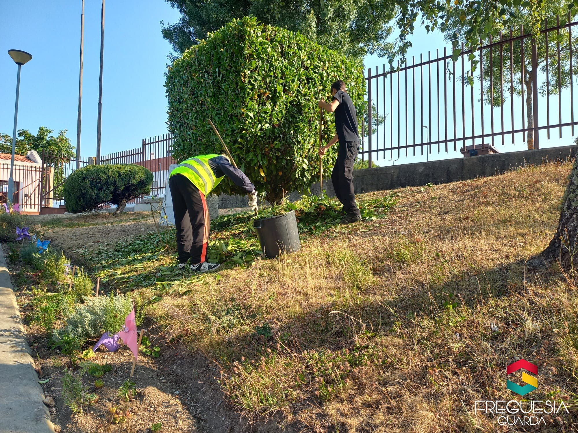 É uma tarefa que compreende o corte de vegetação invasiva, mondar os arbustos, retirar as pernadas mais baixas e proceder à varredura de toda a área que completa os logradouros escolares.